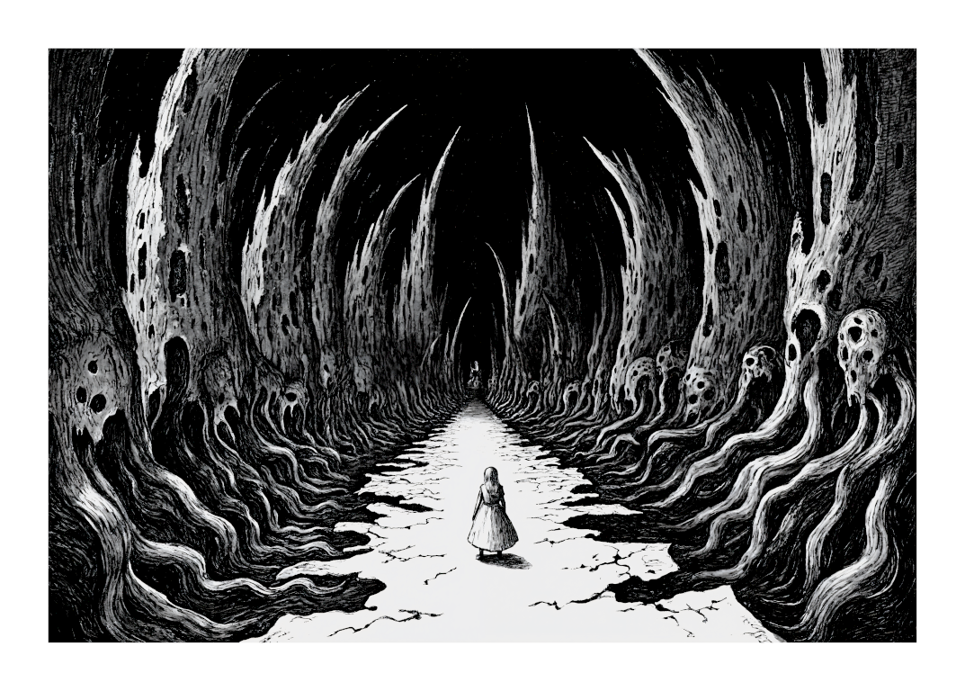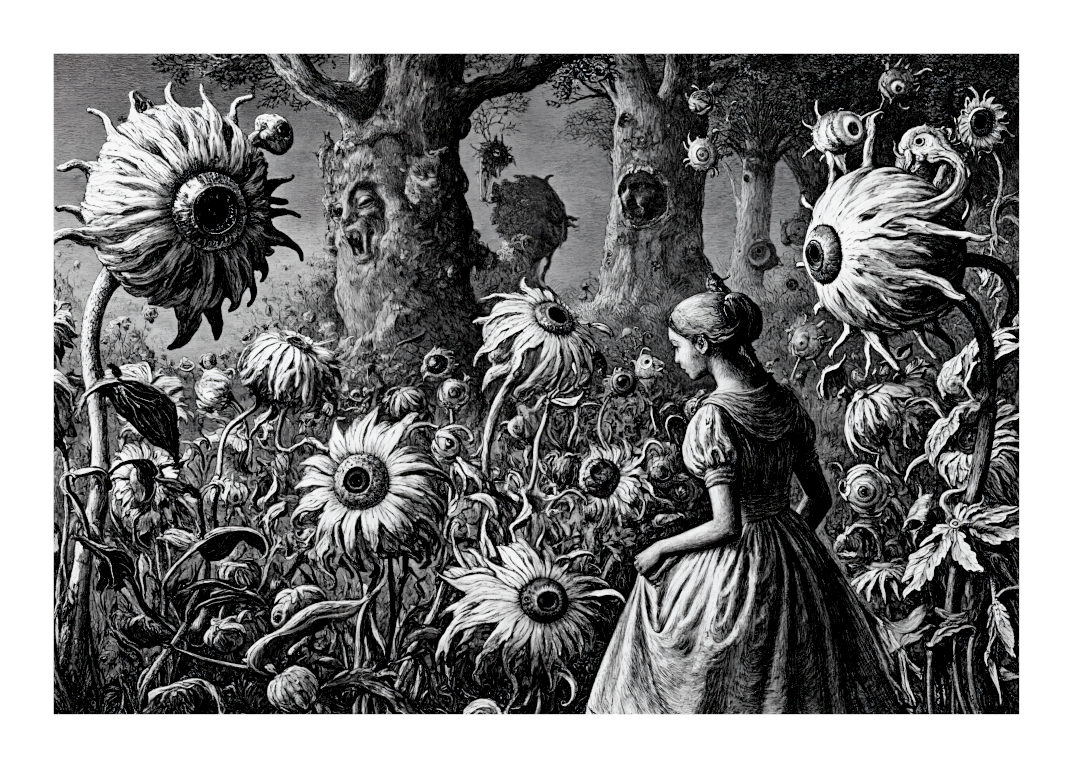 This body of work embraces a deliberately disquieting aesthetic, one that refuses to romanticize Wonderland’s whimsy. Instead, it confronts the viewer with the unsettling duality of the story: the tension between wonder and unease, agency and vulnerability. The images—viscerally rendered and conceptually layered—challenge the passive, idealized portrayals of Alice. Here, she emerges as a figure of resilience, navigating a labyrinth of her own making, unafraid to confront the unknown.